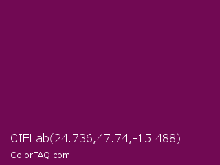 CIELab 24.736,47.74,-15.488 Color is a dark magenta color and the nearest color is Pansy Purple #78184a. Hex code #710953 and RGB value is rgb(113,9,83). In RGB color space, this color is composed of 44% red, 4% green, 33% blue, In CMYK color space, this color is composed of 0% cyan, 92% magenta, 27% yellow , 56% black , In HSL color space, this color has a hue angle of 317° , 85% saturation and 24% lightness.