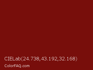 CIELab 24.738,43.192,32.168 Color is a dark red color and the nearest color is Dark Burgundy #770f05. Hex code #780e0b and RGB value is rgb(120,14,11). In RGB color space, this color is composed of 47% red, 5% green, 4% blue, In CMYK color space, this color is composed of 0% cyan, 88% magenta, 91% yellow , 53% black , In HSL color space, this color has a hue angle of 2° , 83% saturation and 26% lightness.