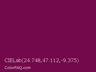 CIELab 24.748,47.112,-9.375 Color is a dark magenta color and the nearest color is Rose Bud Cherry #800b47. Hex code #73094a and RGB value is rgb(115,9,74). In RGB color space, this color is composed of 45% red, 4% green, 29% blue, In CMYK color space, this color is composed of 0% cyan, 92% magenta, 36% yellow , 55% black , In HSL color space, this color has a hue angle of 323° , 85% saturation and 24% lightness.