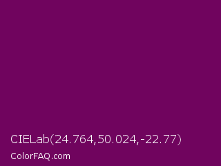 CIELab 24.764,50.024,-22.77 Color is a dark magenta color and the nearest color is French Plum #811453. Hex code #70045e and RGB value is rgb(112,4,94). In RGB color space, this color is composed of 44% red, 2% green, 37% blue, In CMYK color space, this color is composed of 0% cyan, 96% magenta, 16% yellow , 56% black , In HSL color space, this color has a hue angle of 310° , 93% saturation and 23% lightness.