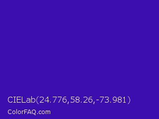 CIELab 24.776,58.26,-73.981 Color is a normal indigo color and the nearest color is Interdimensional Blue #360ccc. Hex code #3c0daf and RGB value is rgb(60,13,175). In RGB color space, this color is composed of 24% red, 5% green, 69% blue, In CMYK color space, this color is composed of 66% cyan, 93% magenta, 0% yellow , 31% black , In HSL color space, this color has a hue angle of 257° , 86% saturation and 37% lightness.