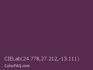 CIELab 24.778,27.212,-13.111 Color is a dark magenta color and the nearest color is Japanese Violet #5b3256. Hex code #592a4f and RGB value is rgb(89,42,79). In RGB color space, this color is composed of 35% red, 16% green, 31% blue, In CMYK color space, this color is composed of 0% cyan, 53% magenta, 11% yellow , 65% black , In HSL color space, this color has a hue angle of 313° , 36% saturation and 26% lightness.