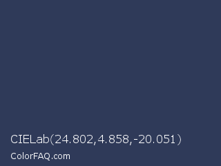 CIELab 24.802,4.858,-20.051 Color is a dark blue color and the nearest color is Pickled Bluewood #314459. Hex code #2f3a59 and RGB value is rgb(47,58,89). In RGB color space, this color is composed of 18% red, 23% green, 35% blue, In CMYK color space, this color is composed of 47% cyan, 35% magenta, 0% yellow , 65% black , In HSL color space, this color has a hue angle of 224° , 31% saturation and 27% lightness.
