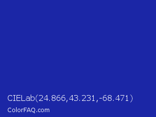 CIELab 24.866,43.231,-68.471 Color is a normal blue color and the nearest color is Torea Bay #0f2d9e. Hex code #1b26a6 and RGB value is rgb(27,38,166). In RGB color space, this color is composed of 11% red, 15% green, 65% blue, In CMYK color space, this color is composed of 84% cyan, 77% magenta, 0% yellow , 35% black , In HSL color space, this color has a hue angle of 235° , 72% saturation and 38% lightness.