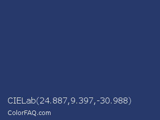 CIELab 24.887,9.397,-30.988 Color is a dark blue color and the nearest color is Rhino #2e3f62. Hex code #26396a and RGB value is rgb(38,57,106). In RGB color space, this color is composed of 15% red, 22% green, 42% blue, In CMYK color space, this color is composed of 64% cyan, 46% magenta, 0% yellow , 58% black , In HSL color space, this color has a hue angle of 223° , 47% saturation and 28% lightness.