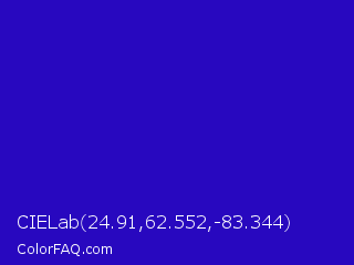 CIELab 24.91,62.552,-83.344 Color is a normal indigo color and the nearest color is Interdimensional Blue #360ccc. Hex code #2808bf and RGB value is rgb(40,8,191). In RGB color space, this color is composed of 16% red, 3% green, 75% blue, In CMYK color space, this color is composed of 79% cyan, 96% magenta, 0% yellow , 25% black , In HSL color space, this color has a hue angle of 250° , 92% saturation and 39% lightness.