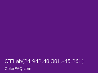 CIELab 24.942,48.381,-45.261 Color is a dark purple color and the nearest color is Honey Flower #4f1c70. Hex code #5c1581 and RGB value is rgb(92,21,129). In RGB color space, this color is composed of 36% red, 8% green, 51% blue, In CMYK color space, this color is composed of 29% cyan, 84% magenta, 0% yellow , 49% black , In HSL color space, this color has a hue angle of 279° , 72% saturation and 29% lightness.