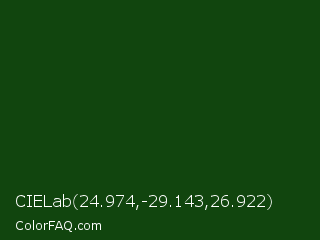 CIELab 24.974,-29.143,26.922 Color is a very dark green color and the nearest color is Dark Fern #0a480d. Hex code #11450e and RGB value is rgb(17,69,14). In RGB color space, this color is composed of 7% red, 27% green, 5% blue, In CMYK color space, this color is composed of 75% cyan, 0% magenta, 80% yellow , 73% black , In HSL color space, this color has a hue angle of 117° , 66% saturation and 16% lightness.