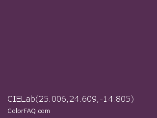 CIELab 25.006,24.609,-14.805 Color is a dark magenta color and the nearest color is Voodoo #533455. Hex code #552d52 and RGB value is rgb(85,45,82). In RGB color space, this color is composed of 33% red, 18% green, 32% blue, In CMYK color space, this color is composed of 0% cyan, 47% magenta, 4% yellow , 67% black , In HSL color space, this color has a hue angle of 305° , 31% saturation and 25% lightness.