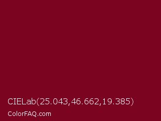 CIELab 25.043,46.662,19.385 Color is a dark red color and the nearest color is Burgundy #800020. Hex code #7b0521 and RGB value is rgb(123,5,33). In RGB color space, this color is composed of 48% red, 2% green, 13% blue, In CMYK color space, this color is composed of 0% cyan, 96% magenta, 73% yellow , 52% black , In HSL color space, this color has a hue angle of 346° , 92% saturation and 25% lightness.