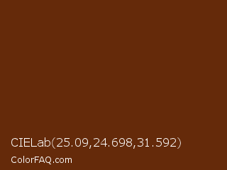 CIELab 25.09,24.698,31.592 Color is a very dark orange color and the nearest color is Hairy Heath #6b2a14. Hex code #652a0a and RGB value is rgb(101,42,10). In RGB color space, this color is composed of 40% red, 16% green, 4% blue, In CMYK color space, this color is composed of 0% cyan, 58% magenta, 90% yellow , 60% black , In HSL color space, this color has a hue angle of 21° , 82% saturation and 22% lightness.