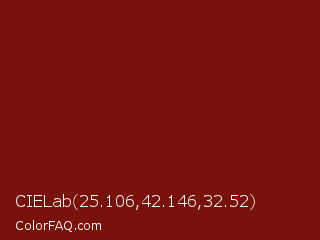 CIELab 25.106,42.146,32.52 Color is a dark red color and the nearest color is Dark Burgundy #770f05. Hex code #78120b and RGB value is rgb(120,18,11). In RGB color space, this color is composed of 47% red, 7% green, 4% blue, In CMYK color space, this color is composed of 0% cyan, 85% magenta, 91% yellow , 53% black , In HSL color space, this color has a hue angle of 4° , 83% saturation and 26% lightness.