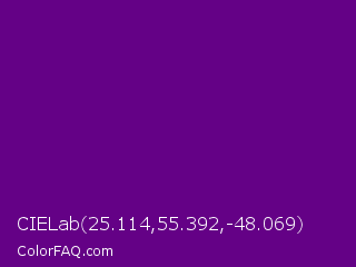 CIELab 25.114,55.392,-48.069 Color is a dark purple color and the nearest color is Purple #660099. Hex code #640186 and RGB value is rgb(100,1,134). In RGB color space, this color is composed of 39% red, 0% green, 53% blue, In CMYK color space, this color is composed of 25% cyan, 99% magenta, 0% yellow , 47% black , In HSL color space, this color has a hue angle of 285° , 99% saturation and 26% lightness.