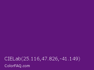 CIELab 25.116,47.826,-41.149 Color is a dark purple color and the nearest color is Honey Flower #4f1c70. Hex code #60157b and RGB value is rgb(96,21,123). In RGB color space, this color is composed of 38% red, 8% green, 48% blue, In CMYK color space, this color is composed of 22% cyan, 83% magenta, 0% yellow , 52% black , In HSL color space, this color has a hue angle of 284° , 71% saturation and 28% lightness.
