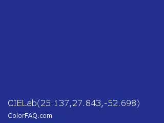 CIELab 25.137,27.843,-52.698 Color is a normal blue color and the nearest color is Cosmic Cobalt #2e2d88. Hex code #22318d and RGB value is rgb(34,49,141). In RGB color space, this color is composed of 13% red, 19% green, 55% blue, In CMYK color space, this color is composed of 76% cyan, 65% magenta, 0% yellow , 45% black , In HSL color space, this color has a hue angle of 232° , 61% saturation and 34% lightness.