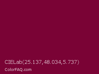 CIELab 25.137,48.034,5.737 Color is a dark rose color and the nearest color is Siren #7a013a. Hex code #7a0335 and RGB value is rgb(122,3,53). In RGB color space, this color is composed of 48% red, 1% green, 21% blue, In CMYK color space, this color is composed of 0% cyan, 98% magenta, 57% yellow , 52% black , In HSL color space, this color has a hue angle of 335° , 95% saturation and 25% lightness.