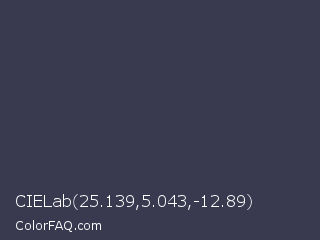 CIELab 25.139,5.043,-12.89 Color is a dark blue color and the nearest color is Bright Gray #3c4151. Hex code #393a4f and RGB value is rgb(57,58,79). In RGB color space, this color is composed of 22% red, 23% green, 31% blue, In CMYK color space, this color is composed of 28% cyan, 27% magenta, 0% yellow , 69% black , In HSL color space, this color has a hue angle of 237° , 16% saturation and 27% lightness.