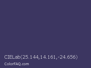 CIELab 25.144,14.161,-24.656 Color is a dark indigo color and the nearest color is Deep Koamaru #333366. Hex code #3c3661 and RGB value is rgb(60,54,97). In RGB color space, this color is composed of 24% red, 21% green, 38% blue, In CMYK color space, this color is composed of 38% cyan, 44% magenta, 0% yellow , 62% black , In HSL color space, this color has a hue angle of 248° , 28% saturation and 30% lightness.