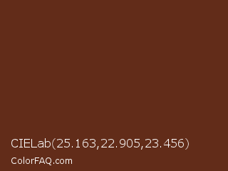 CIELab 25.163,22.905,23.456 Color is a dark orange color and the nearest color is Espresso #612718. Hex code #622c19 and RGB value is rgb(98,44,25). In RGB color space, this color is composed of 38% red, 17% green, 10% blue, In CMYK color space, this color is composed of 0% cyan, 55% magenta, 74% yellow , 62% black , In HSL color space, this color has a hue angle of 16° , 59% saturation and 24% lightness.