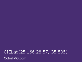 CIELab 25.166,28.57,-35.505 Color is a normal violet color and the nearest color is Minsk #3f307f. Hex code #482d72 and RGB value is rgb(72,45,114). In RGB color space, this color is composed of 28% red, 18% green, 45% blue, In CMYK color space, this color is composed of 37% cyan, 61% magenta, 0% yellow , 55% black , In HSL color space, this color has a hue angle of 263° , 43% saturation and 31% lightness.