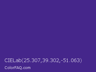 CIELab 25.307,39.302,-51.063 Color is a normal indigo color and the nearest color is Spanish Violet #4c2882. Hex code #45268b and RGB value is rgb(69,38,139). In RGB color space, this color is composed of 27% red, 15% green, 55% blue, In CMYK color space, this color is composed of 50% cyan, 73% magenta, 0% yellow , 45% black , In HSL color space, this color has a hue angle of 258° , 57% saturation and 35% lightness.