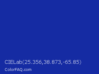 CIELab 25.356,38.873,-65.85 Color is a normal blue color and the nearest color is Torea Bay #0f2d9e. Hex code #152ba3 and RGB value is rgb(21,43,163). In RGB color space, this color is composed of 8% red, 17% green, 64% blue, In CMYK color space, this color is composed of 87% cyan, 74% magenta, 0% yellow , 36% black , In HSL color space, this color has a hue angle of 231° , 77% saturation and 36% lightness.