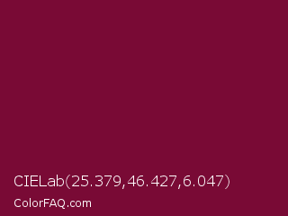 CIELab 25.379,46.427,6.047 Color is a dark rose color and the nearest color is Siren #7a013a. Hex code #790a35 and RGB value is rgb(121,10,53). In RGB color space, this color is composed of 47% red, 4% green, 21% blue, In CMYK color space, this color is composed of 0% cyan, 92% magenta, 56% yellow , 53% black , In HSL color space, this color has a hue angle of 337° , 85% saturation and 26% lightness.
