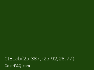 CIELab 25.387,-25.92,28.77 Color is a very dark green color and the nearest color is Green House #24500f. Hex code #1d450b and RGB value is rgb(29,69,11). In RGB color space, this color is composed of 11% red, 27% green, 4% blue, In CMYK color space, this color is composed of 58% cyan, 0% magenta, 84% yellow , 73% black , In HSL color space, this color has a hue angle of 101° , 73% saturation and 16% lightness.