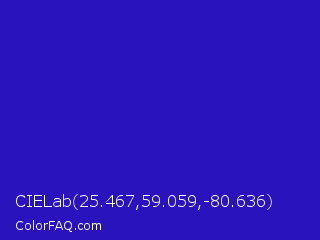 CIELab 25.467,59.059,-80.636 Color is a normal indigo color and the nearest color is Interdimensional Blue #360ccc. Hex code #2913bc and RGB value is rgb(41,19,188). In RGB color space, this color is composed of 16% red, 7% green, 74% blue, In CMYK color space, this color is composed of 78% cyan, 90% magenta, 0% yellow , 26% black , In HSL color space, this color has a hue angle of 248° , 82% saturation and 41% lightness.