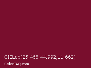 CIELab 25.468,44.992,11.662 Color is a dark rose color and the nearest color is Claret #7f1734. Hex code #790e2d and RGB value is rgb(121,14,45). In RGB color space, this color is composed of 47% red, 5% green, 18% blue, In CMYK color space, this color is composed of 0% cyan, 88% magenta, 63% yellow , 53% black , In HSL color space, this color has a hue angle of 343° , 79% saturation and 26% lightness.