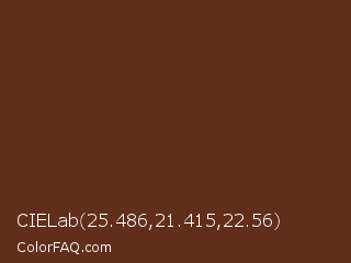 CIELab 25.486,21.415,22.56 Color is a dark orange color and the nearest color is Espresso #612718. Hex code #612e1b and RGB value is rgb(97,46,27). In RGB color space, this color is composed of 38% red, 18% green, 11% blue, In CMYK color space, this color is composed of 0% cyan, 53% magenta, 72% yellow , 62% black , In HSL color space, this color has a hue angle of 16° , 56% saturation and 24% lightness.
