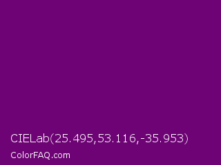 CIELab 25.495,53.116,-35.953 Color is a dark magenta color and the nearest color is Patriarch #800080. Hex code #6d0374 and RGB value is rgb(109,3,116). In RGB color space, this color is composed of 43% red, 1% green, 45% blue, In CMYK color space, this color is composed of 6% cyan, 97% magenta, 0% yellow , 55% black , In HSL color space, this color has a hue angle of 296° , 95% saturation and 23% lightness.