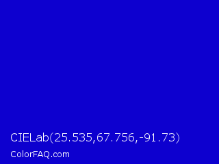 CIELab 25.535,67.756,-91.73 Color is a normal indigo color and the nearest color is Medium Blue #0000cd. Hex code #0d00cf and RGB value is rgb(13,0,207). In RGB color space, this color is composed of 5% red, 0% green, 81% blue, In CMYK color space, this color is composed of 94% cyan, 100% magenta, 0% yellow , 19% black , In HSL color space, this color has a hue angle of 244° , 100% saturation and 41% lightness.