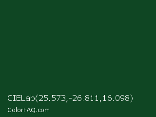 CIELab 25.573,-26.811,16.098 Color is a very dark green color and the nearest color is Zuccini #044022. Hex code #0f4623 and RGB value is rgb(15,70,35). In RGB color space, this color is composed of 6% red, 27% green, 14% blue, In CMYK color space, this color is composed of 79% cyan, 0% magenta, 50% yellow , 73% black , In HSL color space, this color has a hue angle of 142° , 65% saturation and 17% lightness.