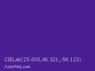 CIELab 25.605,46.321,-56.123 Color is a normal violet color and the nearest color is Daisy Bush #4f2398. Hex code #4b1f94 and RGB value is rgb(75,31,148). In RGB color space, this color is composed of 29% red, 12% green, 58% blue, In CMYK color space, this color is composed of 49% cyan, 79% magenta, 0% yellow , 42% black , In HSL color space, this color has a hue angle of 263° , 65% saturation and 35% lightness.