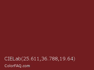 CIELab 25.611,36.788,19.64 Color is a dark red color and the nearest color is Crown Of Thorns #771f1f. Hex code #721e21 and RGB value is rgb(114,30,33). In RGB color space, this color is composed of 45% red, 12% green, 13% blue, In CMYK color space, this color is composed of 0% cyan, 74% magenta, 71% yellow , 55% black , In HSL color space, this color has a hue angle of 358° , 58% saturation and 28% lightness.
