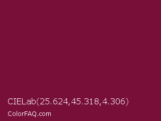 CIELab 25.624,45.318,4.306 Color is a dark rose color and the nearest color is Claret #7f1734. Hex code #780f38 and RGB value is rgb(120,15,56). In RGB color space, this color is composed of 47% red, 6% green, 22% blue, In CMYK color space, this color is composed of 0% cyan, 88% magenta, 53% yellow , 53% black , In HSL color space, this color has a hue angle of 337° , 78% saturation and 26% lightness.
