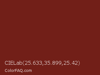 CIELab 25.633,35.899,25.42 Color is a dark red color and the nearest color is Persian Plum #701c1c. Hex code #721f18 and RGB value is rgb(114,31,24). In RGB color space, this color is composed of 45% red, 12% green, 9% blue, In CMYK color space, this color is composed of 0% cyan, 73% magenta, 79% yellow , 55% black , In HSL color space, this color has a hue angle of 5° , 65% saturation and 27% lightness.