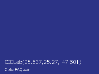 CIELab 25.637,25.27,-47.501 Color is a normal blue color and the nearest color is Cosmic Cobalt #2e2d88. Hex code #2c3386 and RGB value is rgb(44,51,134). In RGB color space, this color is composed of 17% red, 20% green, 53% blue, In CMYK color space, this color is composed of 67% cyan, 62% magenta, 0% yellow , 47% black , In HSL color space, this color has a hue angle of 235° , 51% saturation and 35% lightness.