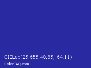 CIELab 25.655,40.85,-64.11 Color is a normal blue color and the nearest color is Blue Pigment #333399. Hex code #2929a1 and RGB value is rgb(41,41,161). In RGB color space, this color is composed of 16% red, 16% green, 63% blue, In CMYK color space, this color is composed of 75% cyan, 75% magenta, 0% yellow , 37% black , In HSL color space, this color has a hue angle of 240° , 59% saturation and 40% lightness.