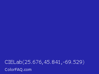 CIELab 25.676,45.841,-69.529 Color is a normal blue color and the nearest color is Blue Pigment #333399. Hex code #2625aa and RGB value is rgb(38,37,170). In RGB color space, this color is composed of 15% red, 15% green, 67% blue, In CMYK color space, this color is composed of 78% cyan, 78% magenta, 0% yellow , 33% black , In HSL color space, this color has a hue angle of 240° , 64% saturation and 41% lightness.