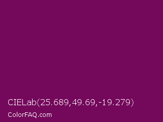 CIELab 25.689,49.69,-19.279 Color is a dark magenta color and the nearest color is French Plum #811453. Hex code #74085b and RGB value is rgb(116,8,91). In RGB color space, this color is composed of 45% red, 3% green, 36% blue, In CMYK color space, this color is composed of 0% cyan, 93% magenta, 22% yellow , 55% black , In HSL color space, this color has a hue angle of 314° , 87% saturation and 24% lightness.