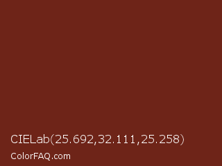 CIELab 25.692,32.111,25.258 Color is a dark red color and the nearest color is Metallic Copper #71291d. Hex code #6e2418 and RGB value is rgb(110,36,24). In RGB color space, this color is composed of 43% red, 14% green, 9% blue, In CMYK color space, this color is composed of 0% cyan, 67% magenta, 78% yellow , 57% black , In HSL color space, this color has a hue angle of 8° , 64% saturation and 26% lightness.