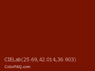 CIELab 25.69,42.014,36.903 Color is a dark red color and the nearest color is Dark Burgundy #770f05. Hex code #7a1402 and RGB value is rgb(122,20,2). In RGB color space, this color is composed of 48% red, 8% green, 1% blue, In CMYK color space, this color is composed of 0% cyan, 84% magenta, 98% yellow , 52% black , In HSL color space, this color has a hue angle of 9° , 97% saturation and 24% lightness.