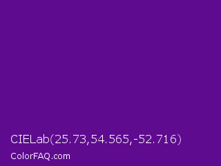 CIELab 25.73,54.565,-52.716 Color is a dark purple color and the nearest color is Purple #660099. Hex code #5f0b8f and RGB value is rgb(95,11,143). In RGB color space, this color is composed of 37% red, 4% green, 56% blue, In CMYK color space, this color is composed of 34% cyan, 92% magenta, 0% yellow , 44% black , In HSL color space, this color has a hue angle of 278° , 86% saturation and 30% lightness.