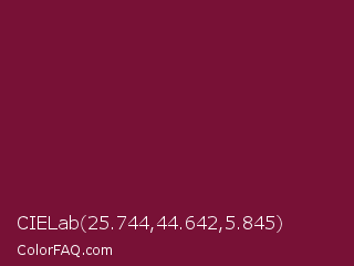 CIELab 25.744,44.642,5.845 Color is a dark rose color and the nearest color is Claret #7f1734. Hex code #781136 and RGB value is rgb(120,17,54). In RGB color space, this color is composed of 47% red, 7% green, 21% blue, In CMYK color space, this color is composed of 0% cyan, 86% magenta, 55% yellow , 53% black , In HSL color space, this color has a hue angle of 338° , 75% saturation and 27% lightness.