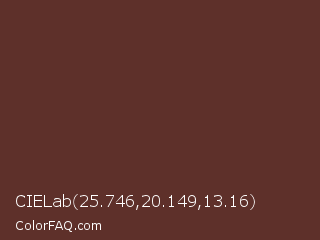 CIELab 25.746,20.149,13.16 Color is a dark red color and the nearest color is Buccaneer #622f30. Hex code #5e302a and RGB value is rgb(94,48,42). In RGB color space, this color is composed of 37% red, 19% green, 16% blue, In CMYK color space, this color is composed of 0% cyan, 49% magenta, 55% yellow , 63% black , In HSL color space, this color has a hue angle of 7° , 38% saturation and 27% lightness.