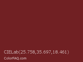CIELab 25.758,35.697,18.461 Color is a dark red color and the nearest color is Crown Of Thorns #771f1f. Hex code #712023 and RGB value is rgb(113,32,35). In RGB color space, this color is composed of 44% red, 13% green, 14% blue, In CMYK color space, this color is composed of 0% cyan, 72% magenta, 69% yellow , 56% black , In HSL color space, this color has a hue angle of 358° , 56% saturation and 28% lightness.