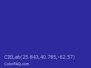 CIELab 25.843,40.785,-62.57 Color is a normal indigo color and the nearest color is Blue Pigment #333399. Hex code #2f299f and RGB value is rgb(47,41,159). In RGB color space, this color is composed of 18% red, 16% green, 62% blue, In CMYK color space, this color is composed of 70% cyan, 74% magenta, 0% yellow , 38% black , In HSL color space, this color has a hue angle of 243° , 59% saturation and 39% lightness.