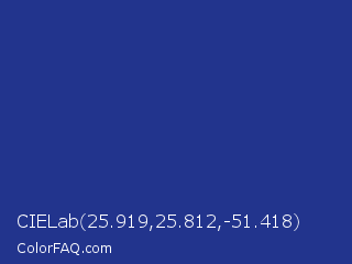 CIELab 25.919,25.812,-51.418 Color is a normal blue color and the nearest color is Bay Of Many #273a81. Hex code #22348d and RGB value is rgb(34,52,141). In RGB color space, this color is composed of 13% red, 20% green, 55% blue, In CMYK color space, this color is composed of 76% cyan, 63% magenta, 0% yellow , 45% black , In HSL color space, this color has a hue angle of 230° , 61% saturation and 34% lightness.